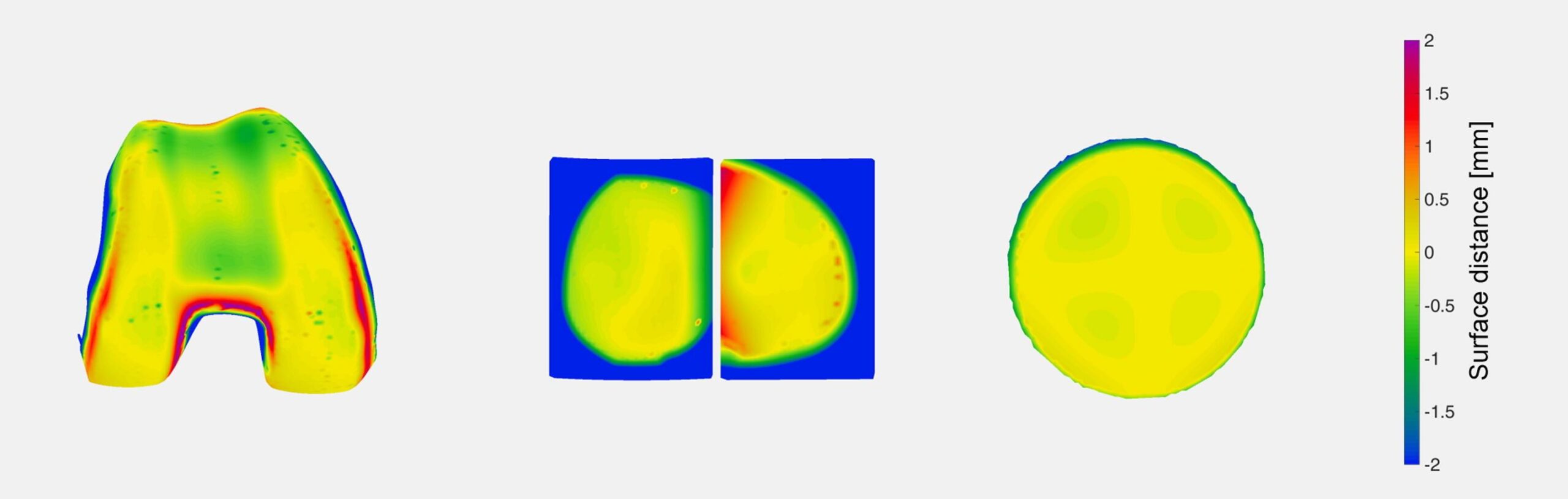 El diseño del implante en la artroplastia total de rodilla afecta en gran medida la funcionalidad postoperatoria, por lo que su optimización es de gran importancia. Sin embargo, se sabe poco acerca de cómo los parámetros de diseño de implantes afectan la cinemática activa de la rodilla. Se realizaron análisis integrales de sensibilidad in silico e in vitro, basados ​​en un conjunto de implantes de rodilla físicos específicos del paciente y los datos de geometría de la superficie del implante de rodilla y hueso correspondiente. Las superficies de los implantes se parametrizaron y variaron sistemáticamente, lo que dio como resultado 85 modelos diferentes de superficies de implantes de rodilla. Además, se investigaron cuatro variaciones de los parámetros del mecanismo extensor, siendo los puntos de unión muscular los que definen el ángulo Q. Las variaciones se evaluaron en un modelo de simulación multicuerpo específico del paciente y en un banco de pruebas experimental y se analizaron las contribuciones de diferentes diseños de implantes y parámetros del mecanismo extensor en la cinemática.